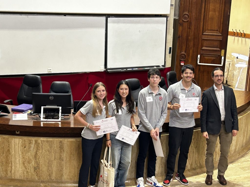Fouad Chalouhi, Mary Custo, Mateja Fantini et Célestine Lung (élèves de 3e E) se sont brillamment qualifiés pour l’épreuve finale regroupant les 20 meilleures équipes de France et du réseau AEFE. Cette finale a eu lieu au prestigieux Conservatoire National des Arts et Métiers à Paris où ils se sont rendus avec leur professeure de mathématiques, Mme Catherine Mevel et le Directeur du collège, M. Franck Fantino.