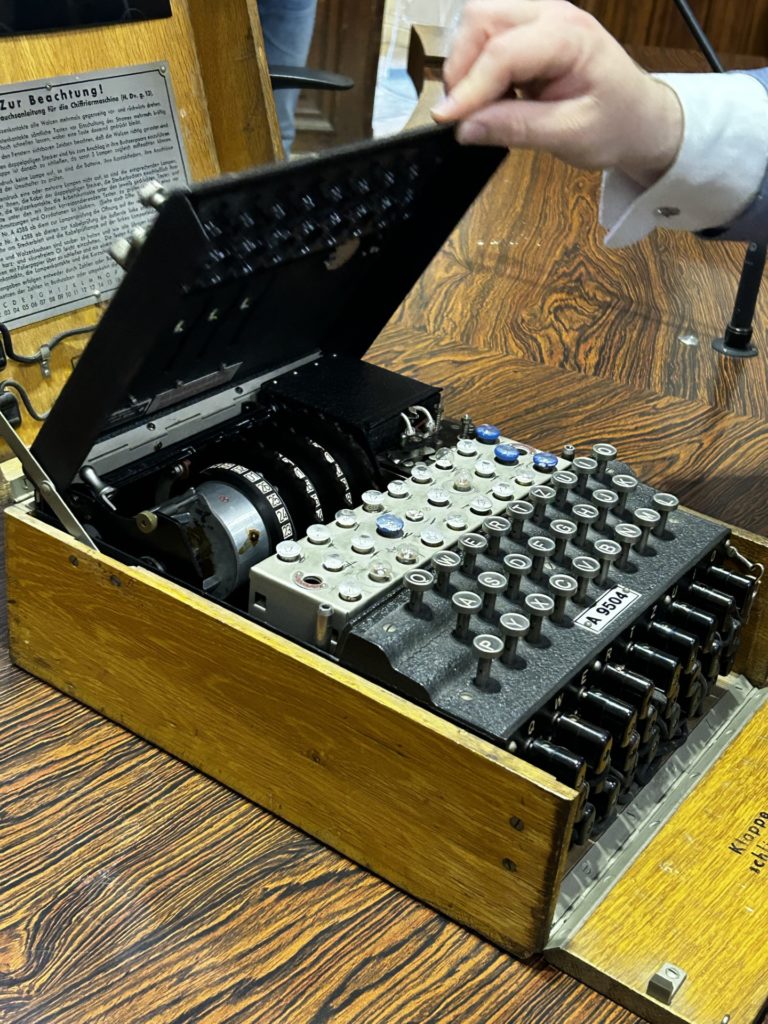 L’après midi, les participants ont eu la chance d’assister à une conférence sur Enigma, célèbre machine à déchiffrer utilisée lors de la Seconde Guerre Mondiale. Une réplique moderne était présentée aux participants pour faire comprendre son fonctionnement et, chose rare, une machine d’époque était exposée. L’agent de la DGSE en charge de la conférence l’a ouverte afin de faire découvrir son système.
