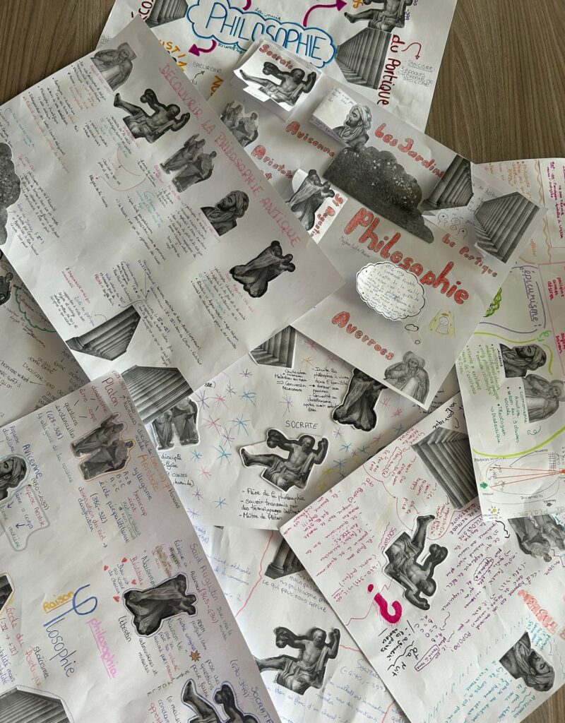 Dans le cadre de l’option philosophie avec Mme Lopez, les élèves de seconde ont mené un projet créatif autour des sketch-notes. En groupes, ils ont mobilisé les notions étudiées en cours pour en proposer une synthèse visuelle, mêlant mots-clés et organisation graphique.