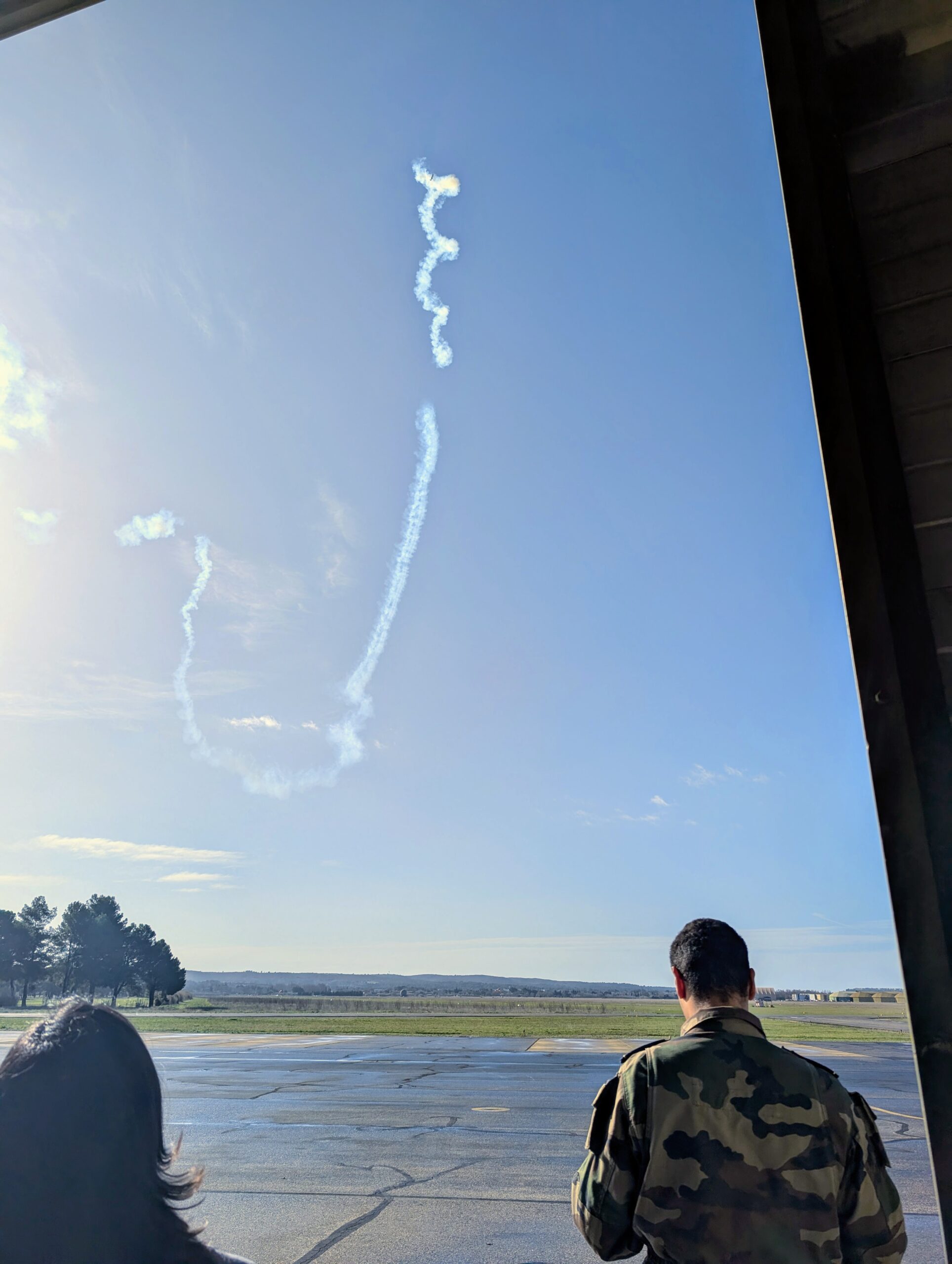 La suite du programme n’en est pas moins réjouissante : départ pour la partie sud de la base afin de retrouver les Alphajets de la Patrouille de France. Les élèves ont pu suivre l’intégralité de la séance d’entraînement, du décollage aux figures travaillées, jusqu’à l’atterrissage et l’arrêt des moteurs, et même écouter les échanges entre l’équipe au sol et le leader Athos pendant le vol.
