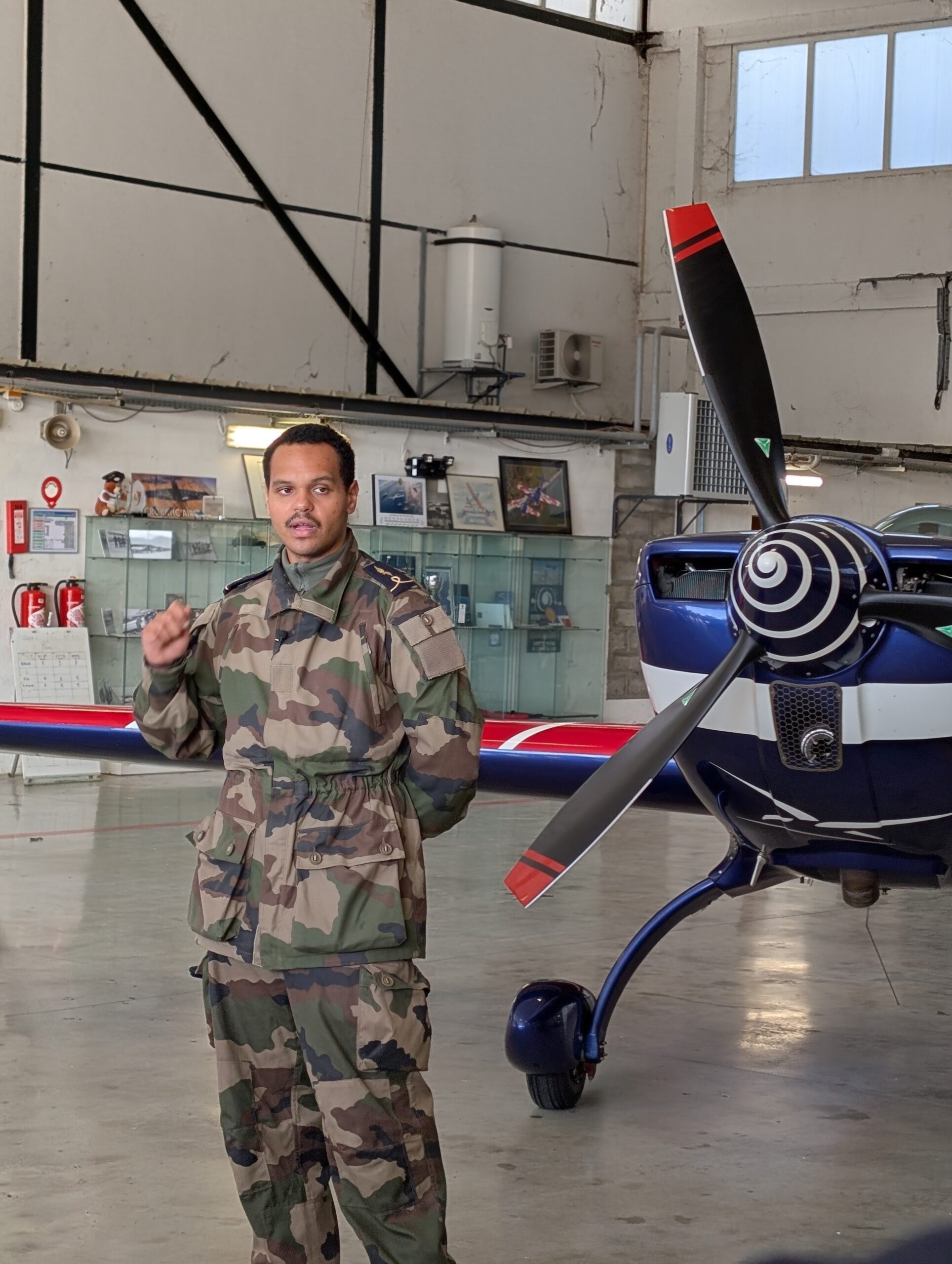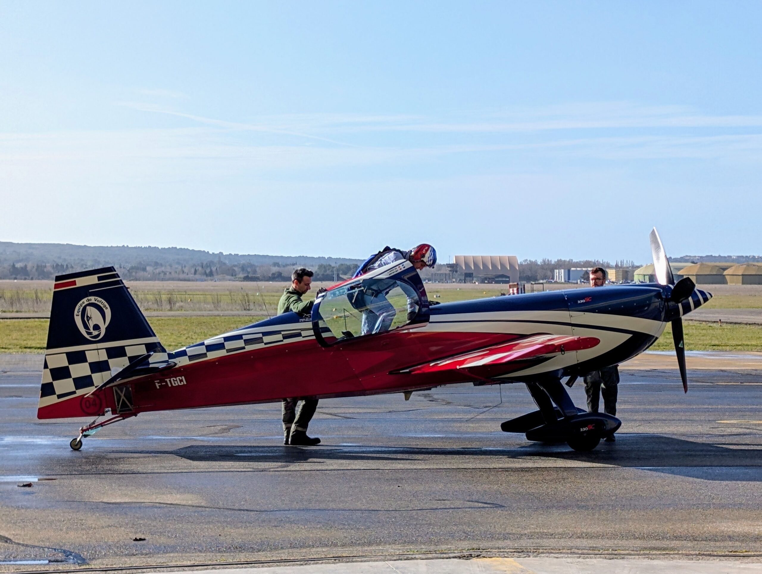 Accueillis par l’aspirant François, la première partie de la visite s’est déroulée lors de l’entraînement de l’Équipe de voltige de l’Armée de l’air et de l’espace (EVAAE). Cette équipe représente l’armée dans les compétitions de voltige et les divers meetings aériens en France et à l’international. Aux commandes de leurs Extra 330, les pilotes exécutent des enchaînements de figures particulièrement techniques, tout en encaissant de fortes accélérations, positives comme négatives.