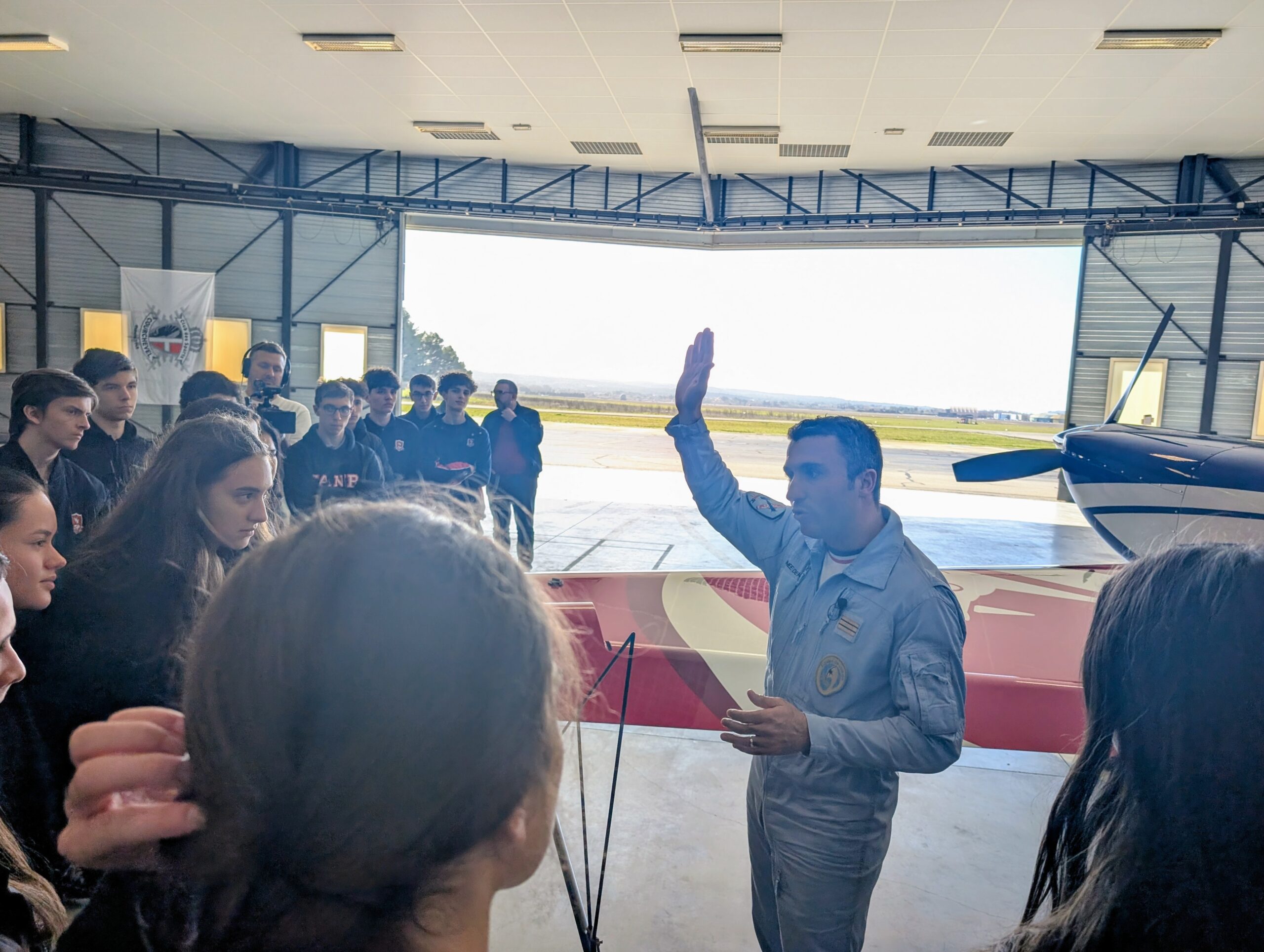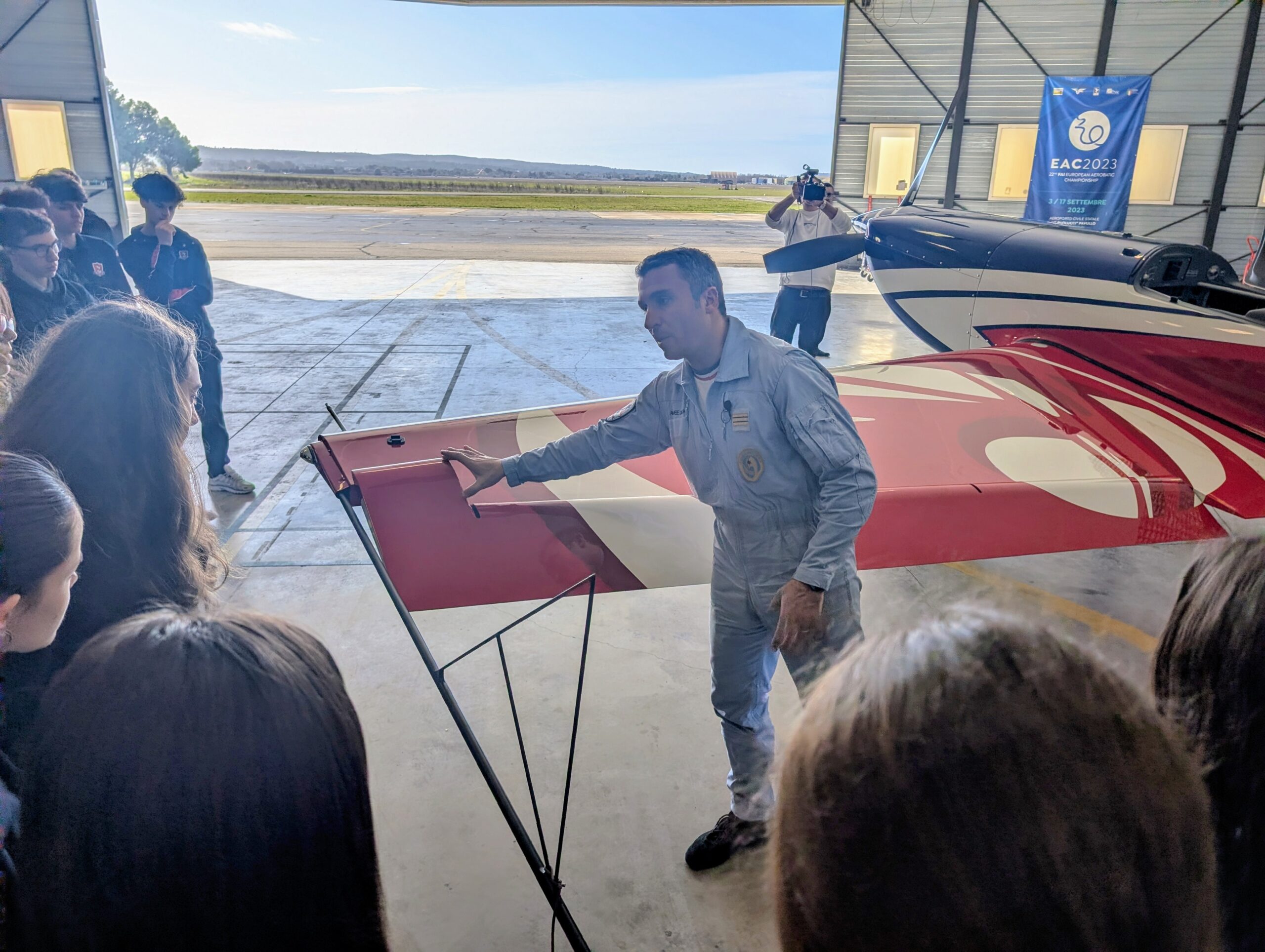 Le capitaine Oddon, double champion du monde de voltige aérienne, enchaîne, sous le regard attentif des lycéens, les figures artistiques et techniques avant de revenir au sol pour partager son expérience avec eux et répondre à leurs questions.