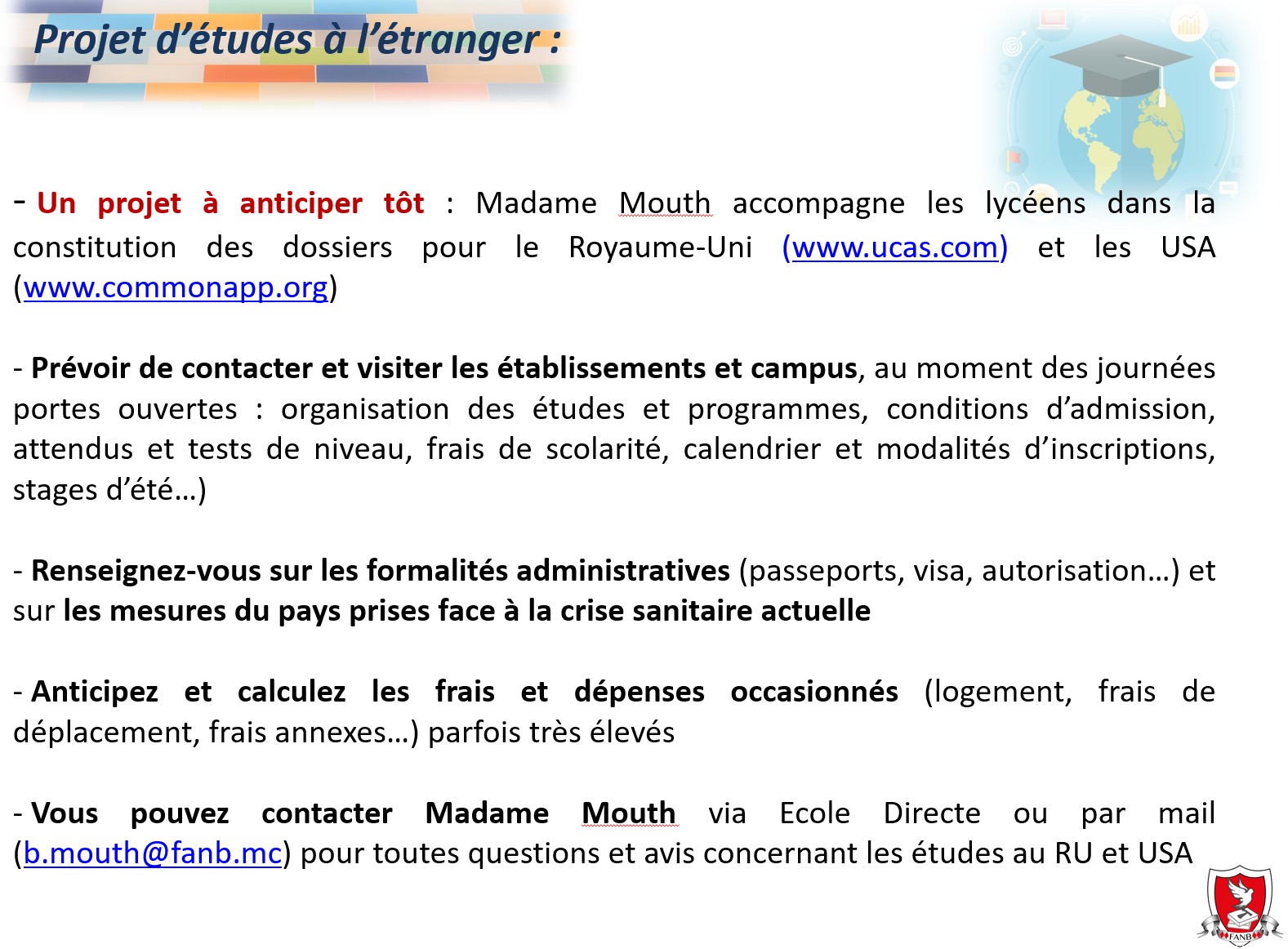 Un projet à anticiper dès la classe de première : Si vous avez envie de poursuivre vos études à l’étranger, le projet se travaille dès la classe de première et il est important de vous signaler au plus tôt auprès de Mme Mouth qui vous accompagne dans la constitution des dossiers pour le Royaume-Uni (www.ucas.com) et les USA (www.commonapp.org)